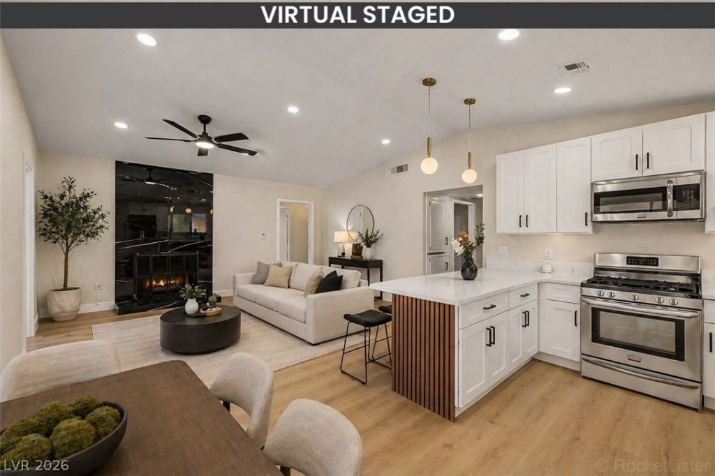 BEAUTIFULLY UPDATED Single-level home, ready to move in! Separate bedroom with its own mini split HVAC. Perfect to rent as a studio with its own exterior entrance. Freshly painted inside & out with 4 beds & 2 baths. The inviting interior boasts clean lines that promote a modern feel! Enhanced by vaulted ceilings, a neutral palette, new LVP flooring t/out, new ceiling fans & light fixtures, and abundant natural light. With a cozy fireplace as the focal point. You'll love the renewed kitchen boasting SS appliances, quartz counters, white shaker cabinets, and a peninsula w/breakfast bar. One secondary bedroom has access to the Jack & Jill bathroom. Both bathrooms were updated with newer fixtures. Relax under the covered patio of your spacious backyard! Conveniently located close to schools, restaurants, and shopping. Make this one yours!